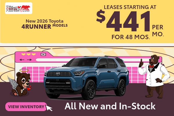 2026 4Runner SR5 for $441 for 48 months with $3999 down. Qualified lessees can lease a new 2026 4Runner SR5 for $441 per month with $3999 due at signing. Based on 12,000 miles / year. Security deposit waived. Lease excludes tax, title, license, registration fees, and dealer optoions and charges. *Payments made be deferred for the first 90 days through SETF with approved credit. Interest accrues from inception / contract date. 2026 4Runner VIN: JTEVA5BR0T5082178. All offers exclude tax, tag, registration, title and $898 dealer fee.