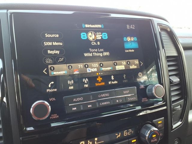 - Radio: NissanConnect w/Navigation -inc: 9" touchscreen display, 6 speakers, Apple CarPlay, Android Auto, HD Radio, SiriusXM satellite radio, SiriusXM Traffic, SiriusXM Travel Link w/weather, fuel prices, movie listings, stock info, TomTom weather, Nissan door to door navigation w/3D building graphics and satellite imagery, online POI search, over-the-air map updates and online premium traffic information, 2-USB (1 type A, 1 type C) connection ports for iPod interface and other compatible devices, 2 USB A ports (charge only), Bluetooth® hands-free phone system, streaming audio via Bluetooth®, hands-free text messaging assistant, Nissan Connect services, WiFi hotspot, Nissan voice recognition for navigation and audio, Siri Eyes Free and follow me home function